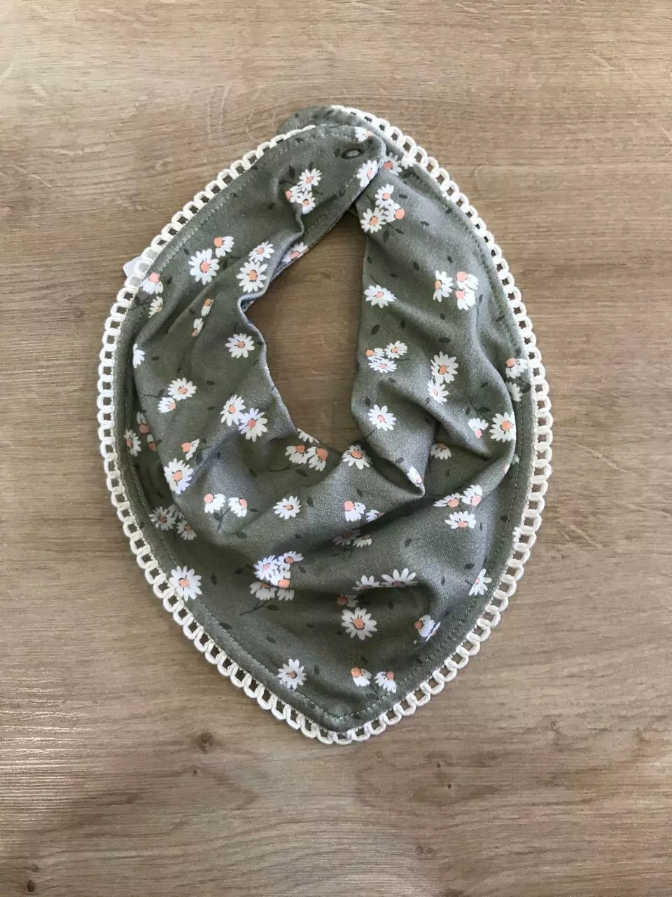 Babador bandana algodão com elastano, na cor verde miltar e creme, estampa de margaridas.