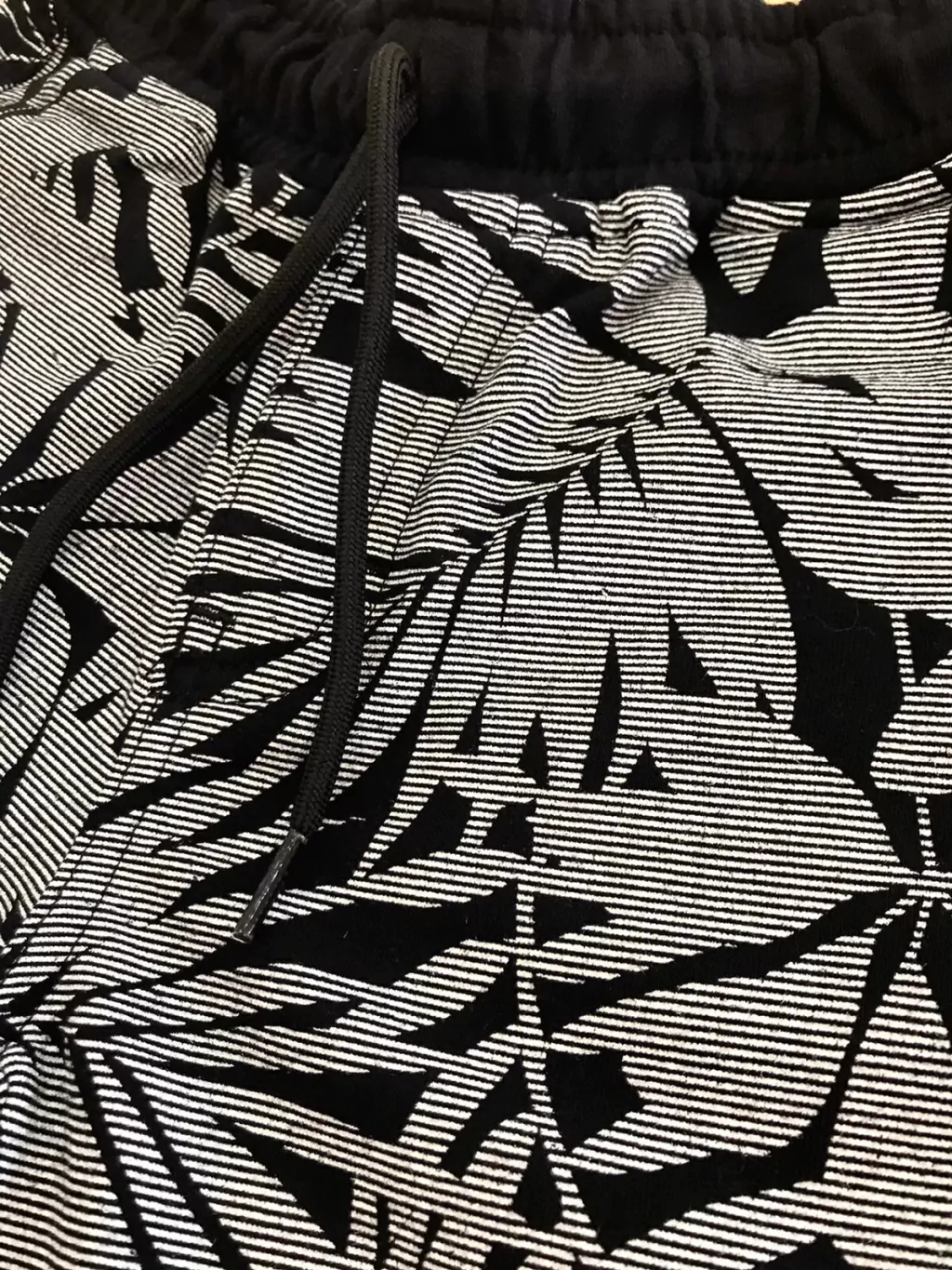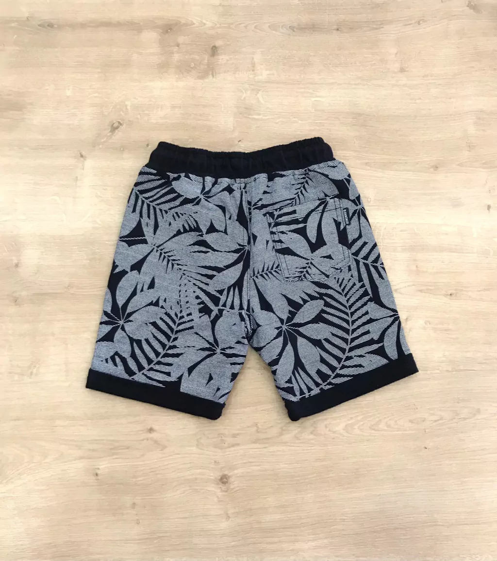 Bermuda moletinho na cor preto estampado de folhas com elástico no cós, cadarço para regular, bolsos nas laterais e um atrás.