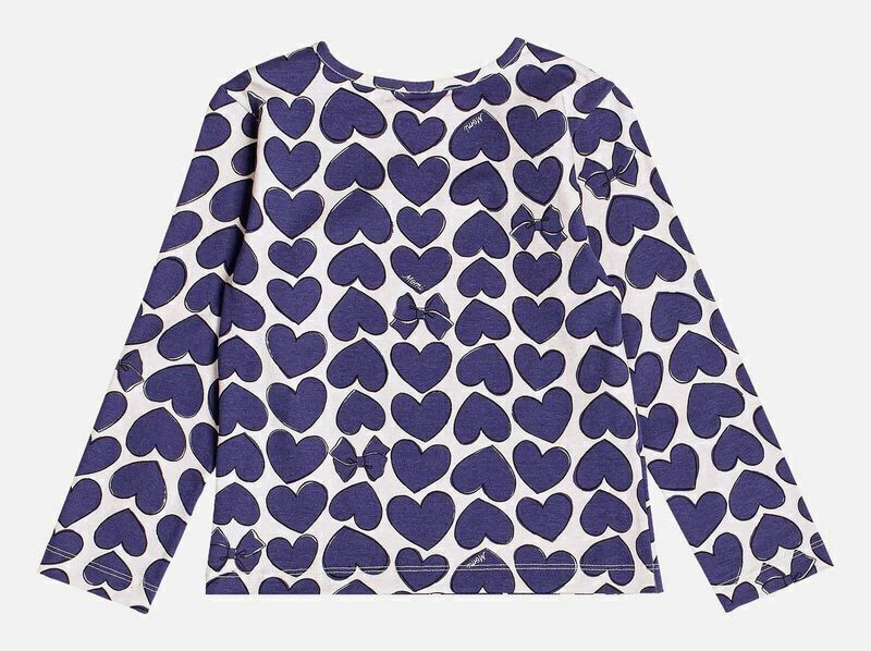 Blusa manga longa bege com estampa de laços e corações azul marinho.