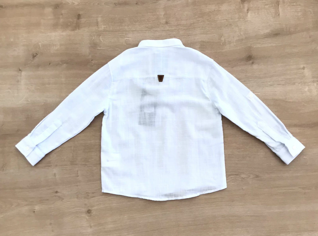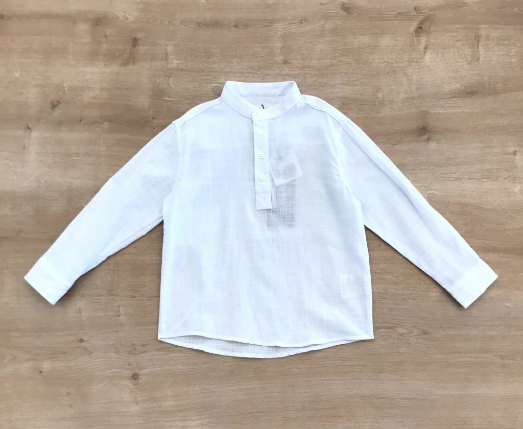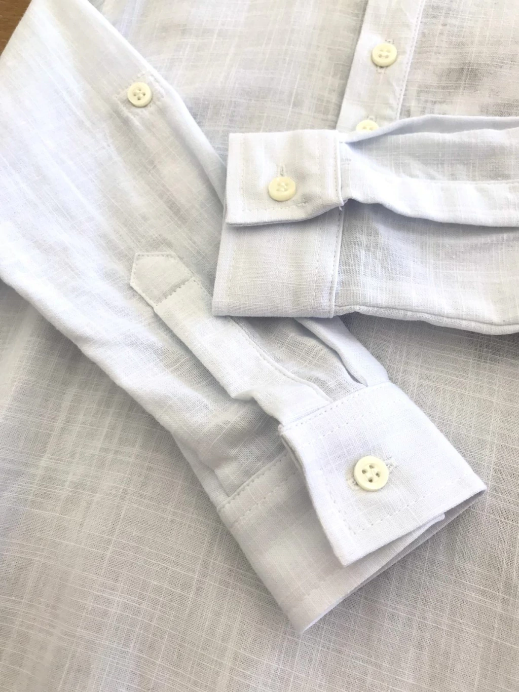 Camisa bata linho na cor lisa branco com botões manuais na frente e nas mangas.