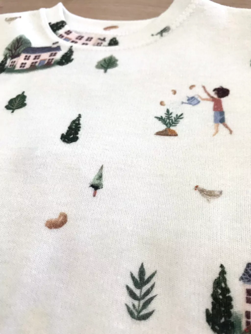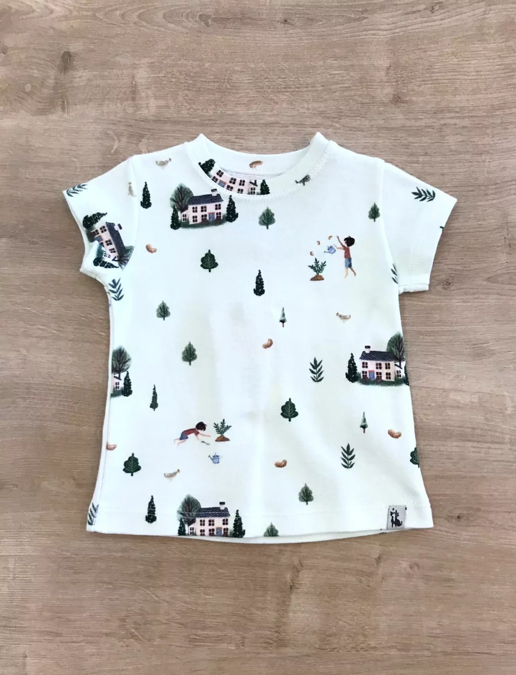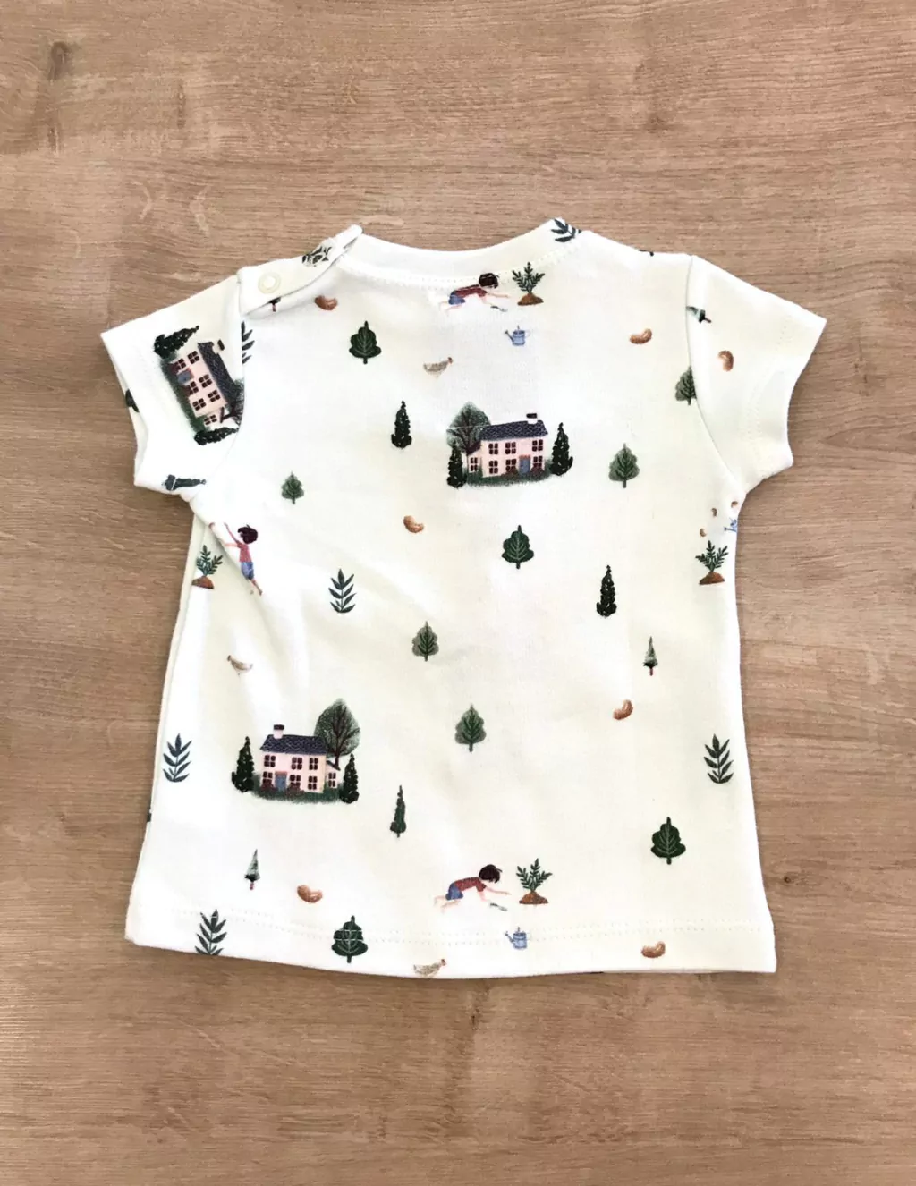 Camiseta manga curta estampa ''João e o pé de feijão'' na cor baunilha da marca The Mini Forest, com botões de pressão no ombro.