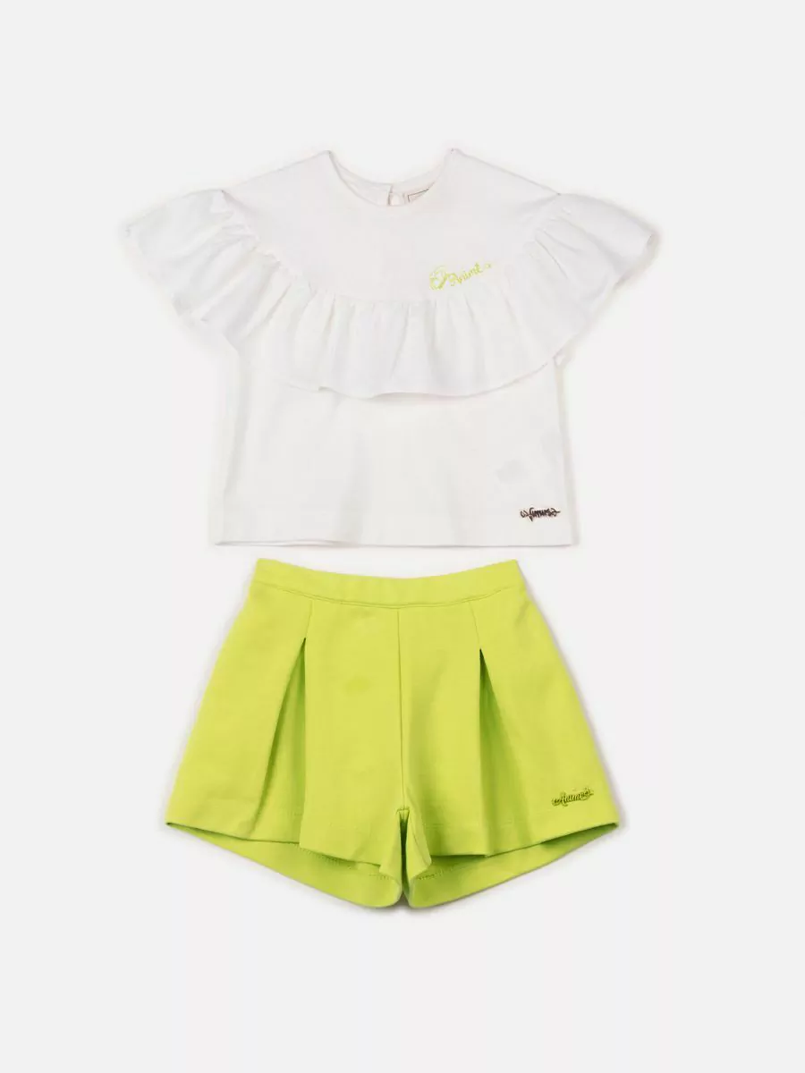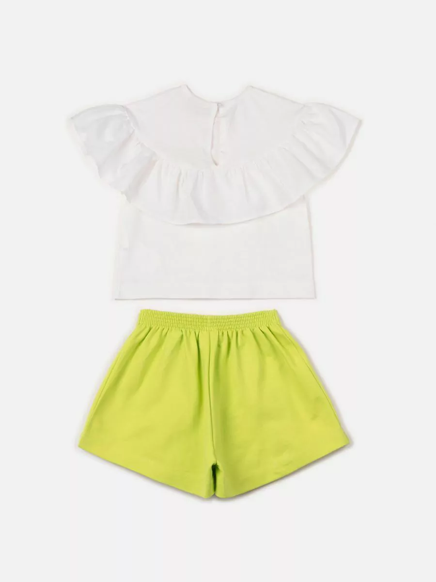 Conjunto blusa na cor pérola com babado e botão manual atrás para abertura, shorts moletom na cor verde limão com elástico na cintura e pregueado na frente.