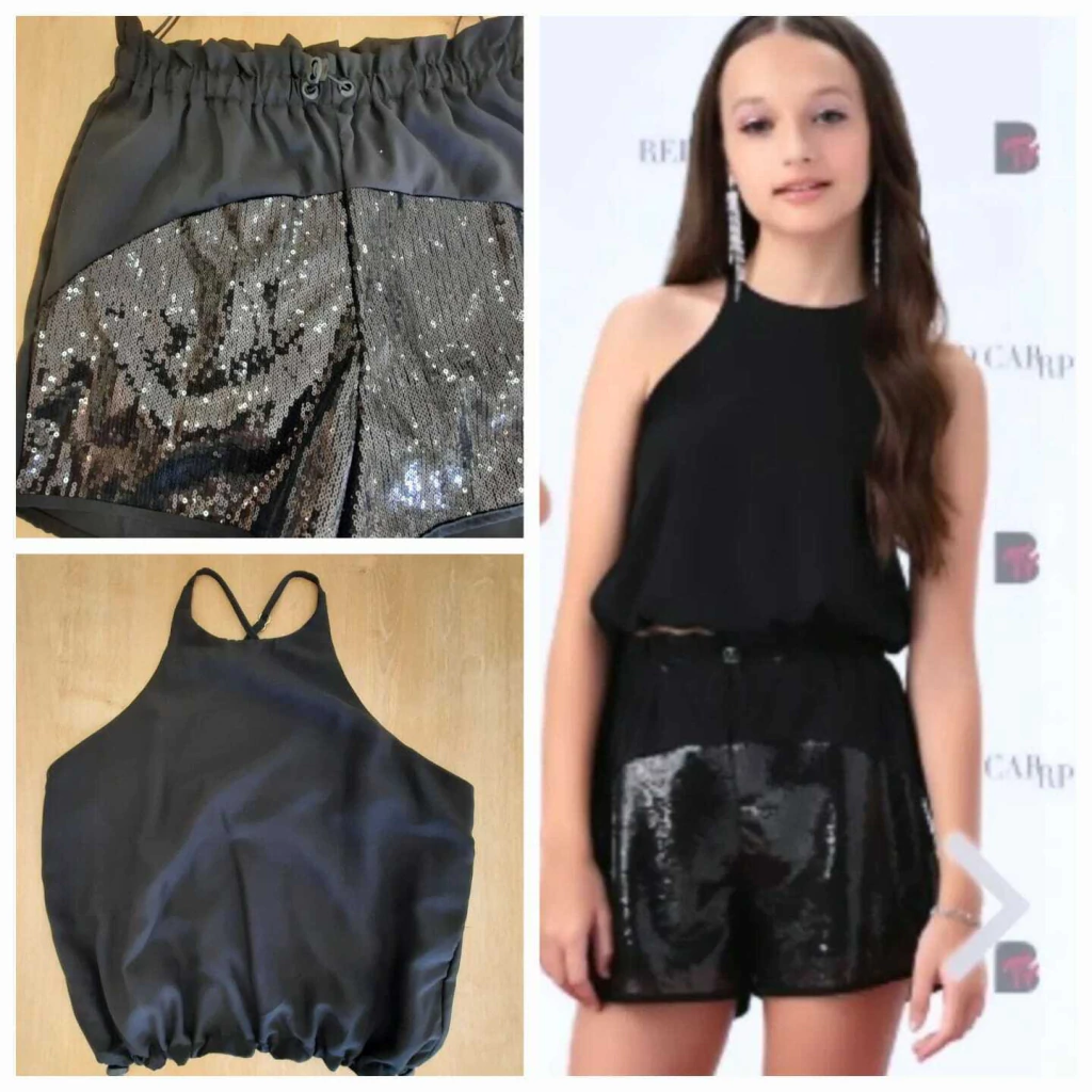 Conheça o Conjunto composto por blusa regata preta com um elegante detalhe de alças cruzadas nas costas e cintura com elástico ajustável. O short preto, por sua vez, possui cós elástico e um sofisticado acabamento em paetê, que traz um brilho especial à peça.