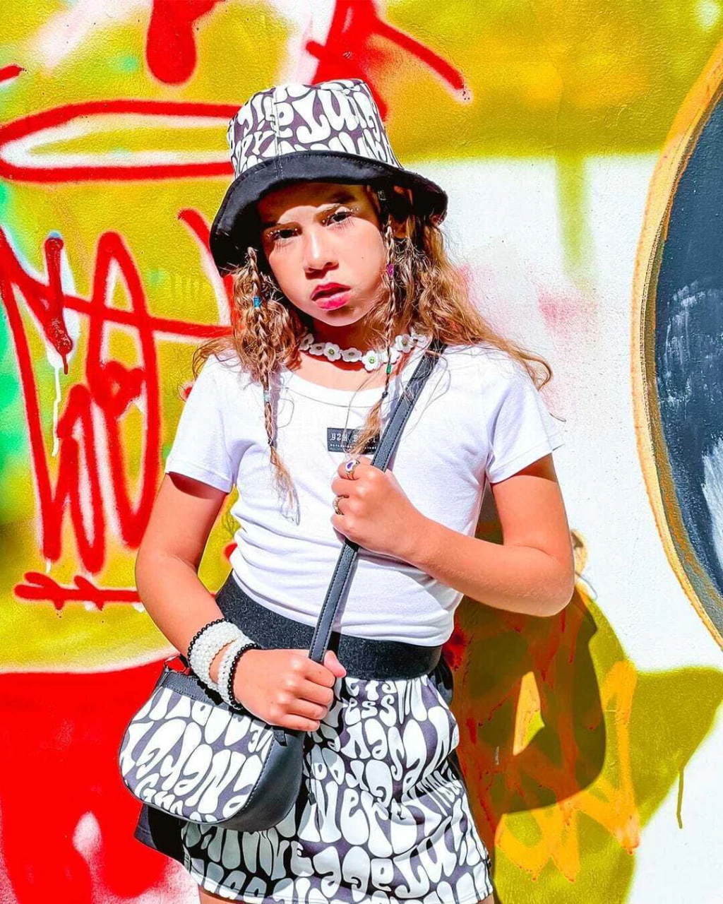 Este conjunto é composto por uma blusa manga curta branca com um detalhe central de plaquinha estampada, que traz um toque de estilo e originalidade. O short saia preto possui uma estampa frontal, cós elástico e bolsos laterais, oferecendo conforto e praticidade para as crianças.