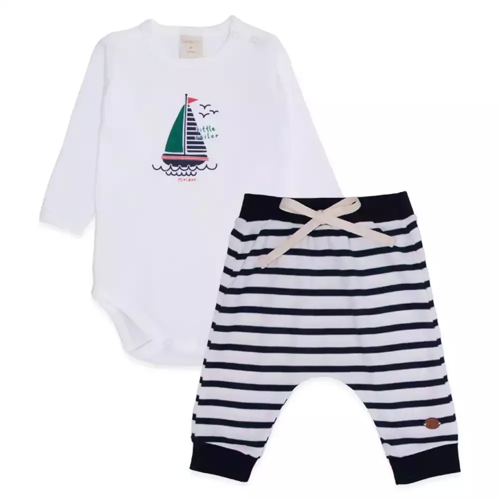 Conjunto composto por body suedine na cor off com estampa de barco e calça suedine com elástano com listras off e marinho e cós elástico.