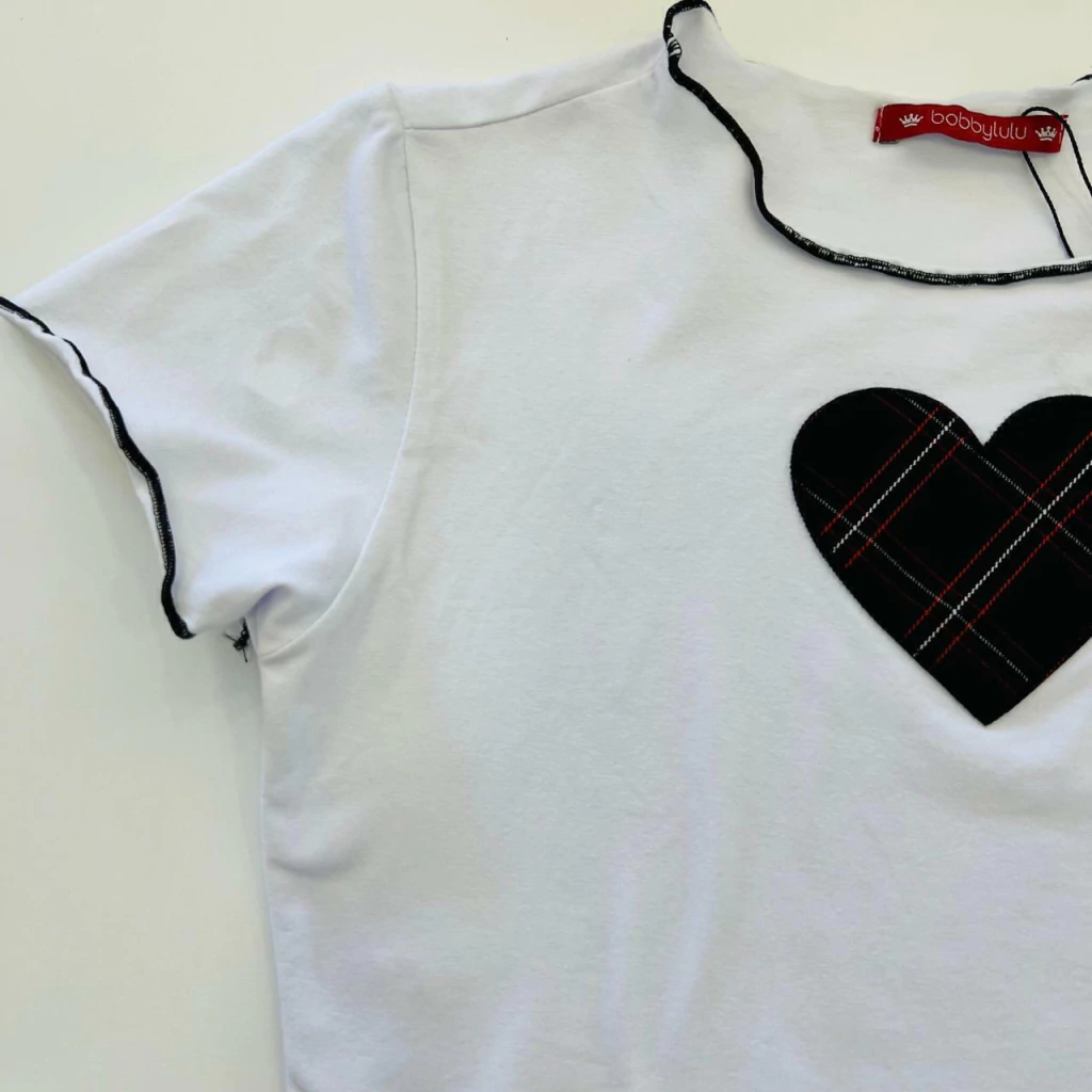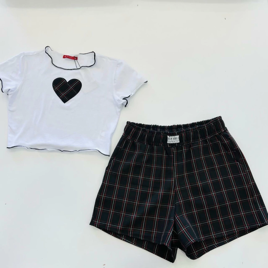 O cropped é confeccionado em algodão e elastano na cor branca, apresentando um delicado coração central que incorpora o design xadrez do short. Este detalhe não só embeleza a peça, como também a torna única e especial.