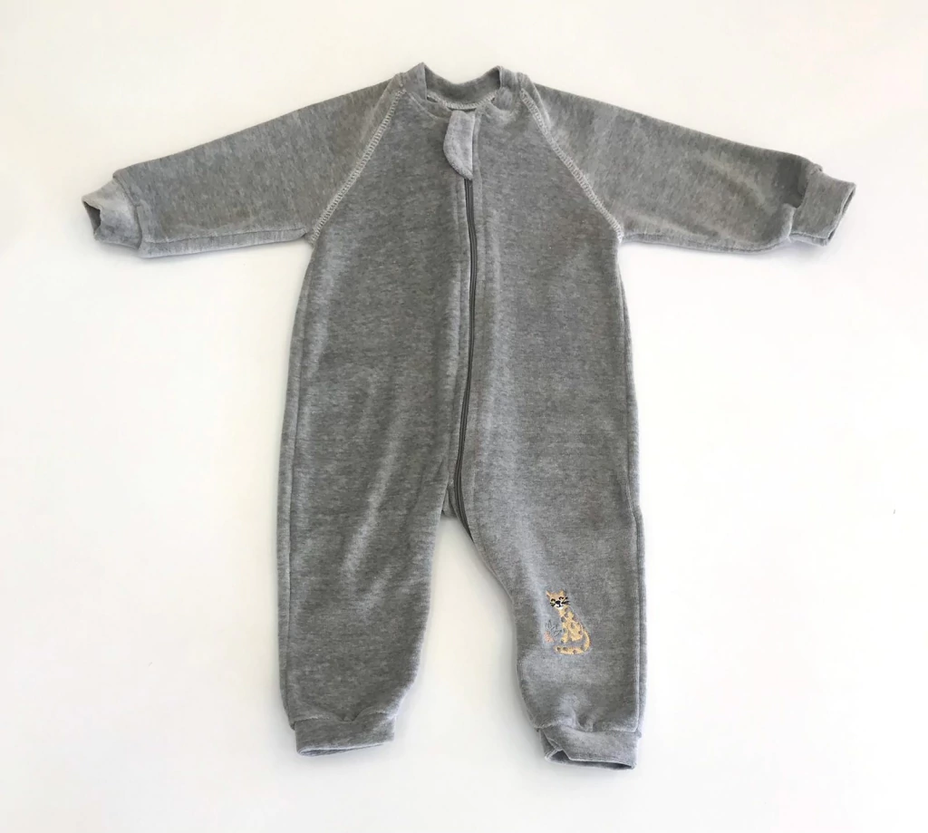 Macacão manga longa plush na cor lisa mescla com desenho bordado de um lado na frente da perna e zíper na frente para abertura, babador bandana estampado de listra nas cores lisas mescla e off com botão de pressão para abertura, lado atoalhado e outro suedine.