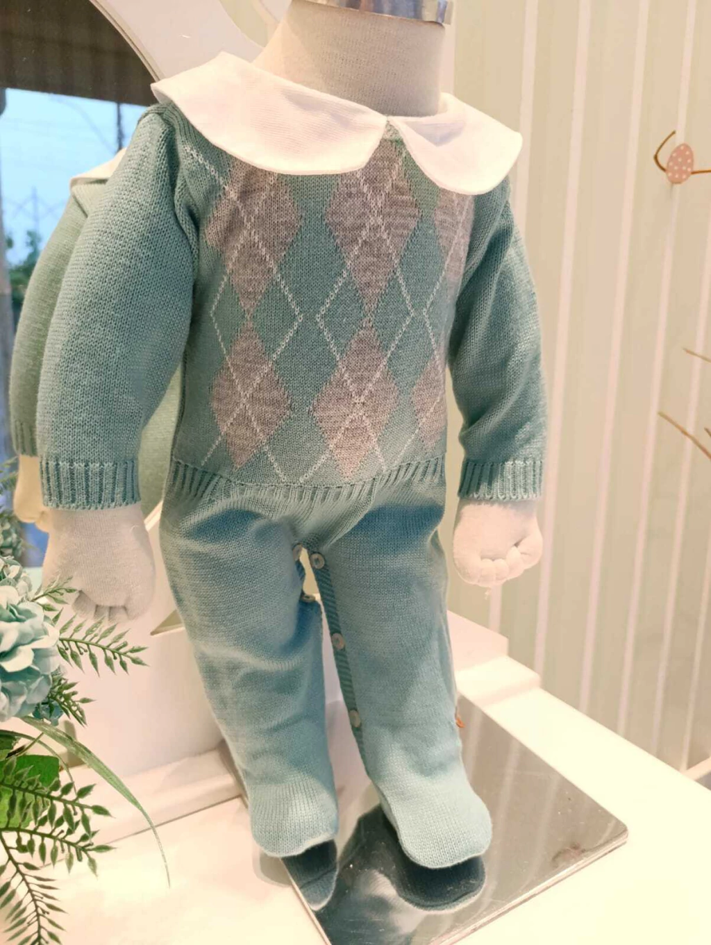 Macacão manga longa tricot jacquard verde menta e com gola.
