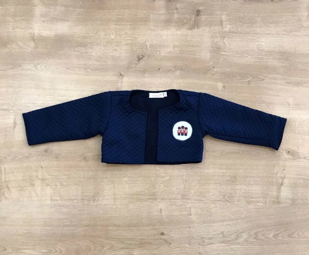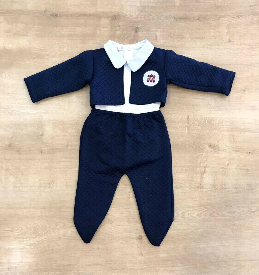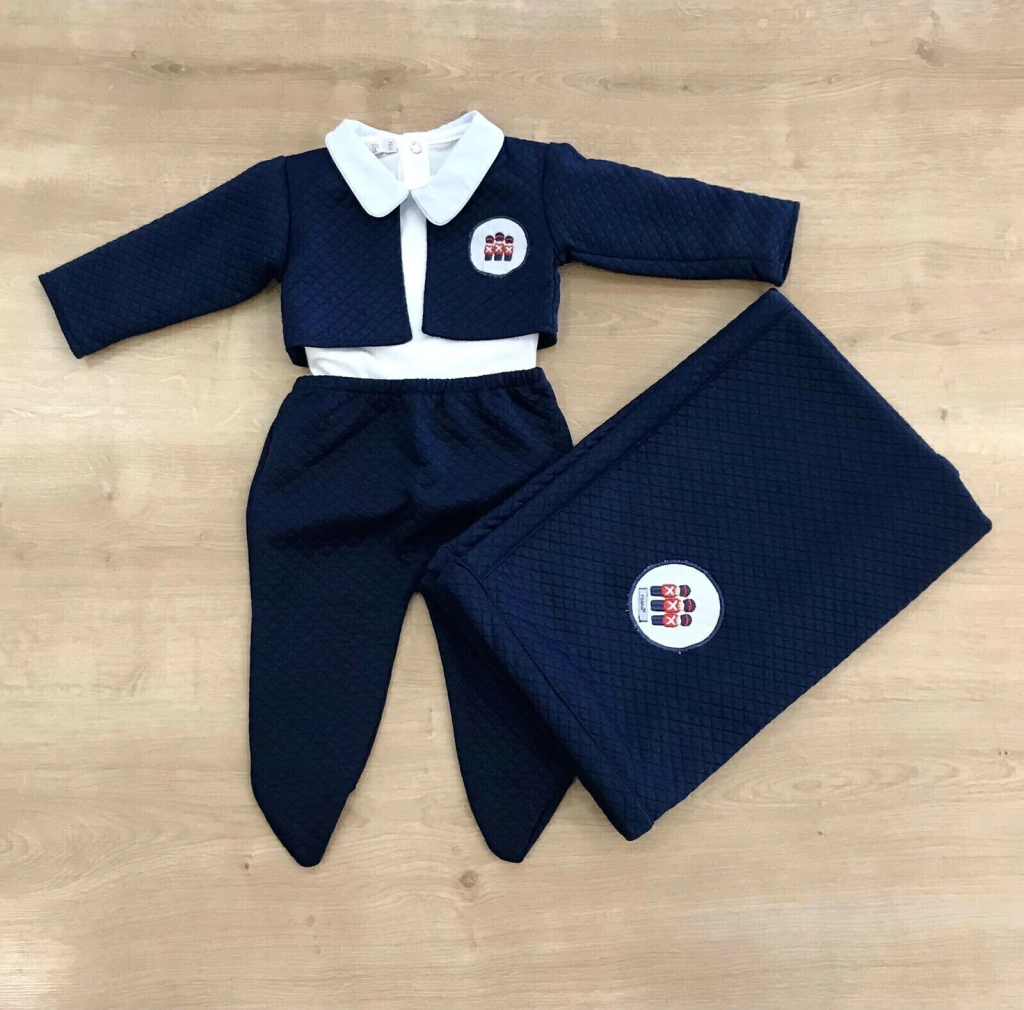 DESCRIÇÃO A Saída de Maternidade Matelassada 4 Peças Soldadinho Roana é a escolha perfeita para receber seu pequeno com muito estilo e conforto! Composta por um body na cor off com gola azul clara, calça, casaco e uma manta, todos em azul marinho, essa coleção é ideal para momentos especiais.