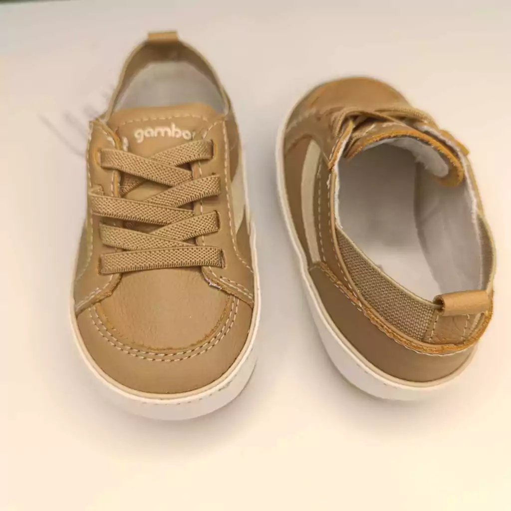 TENIS EM COURO CANELA E QUINOA GAMBO: projetados para se adaptar perfeitamente aos pezinhos dos bebês, proporcionando uma sensação de aconchego e segurança.
