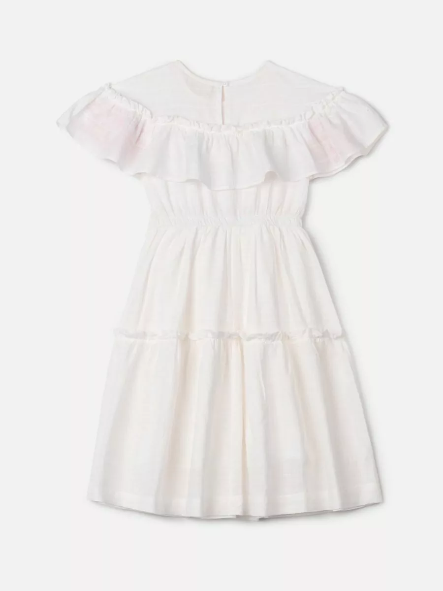Vestido na cor off com babado e flores na cor lisa pink bordada, elástico na cintura, faixa para laço e botão manual atrás para abertura.